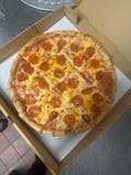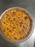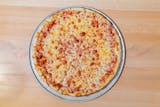 A 10-inch pizza with a base of sausage gravy and topped with mozzarella, green peppers, onions, bacon, and 3 over easy eggs