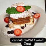 2 slices of a fresh thick cut bread stuffed with cannoli cream, chocolate chips, (with or without bananas), powdered sugar served with a choice of bacon or sausage.